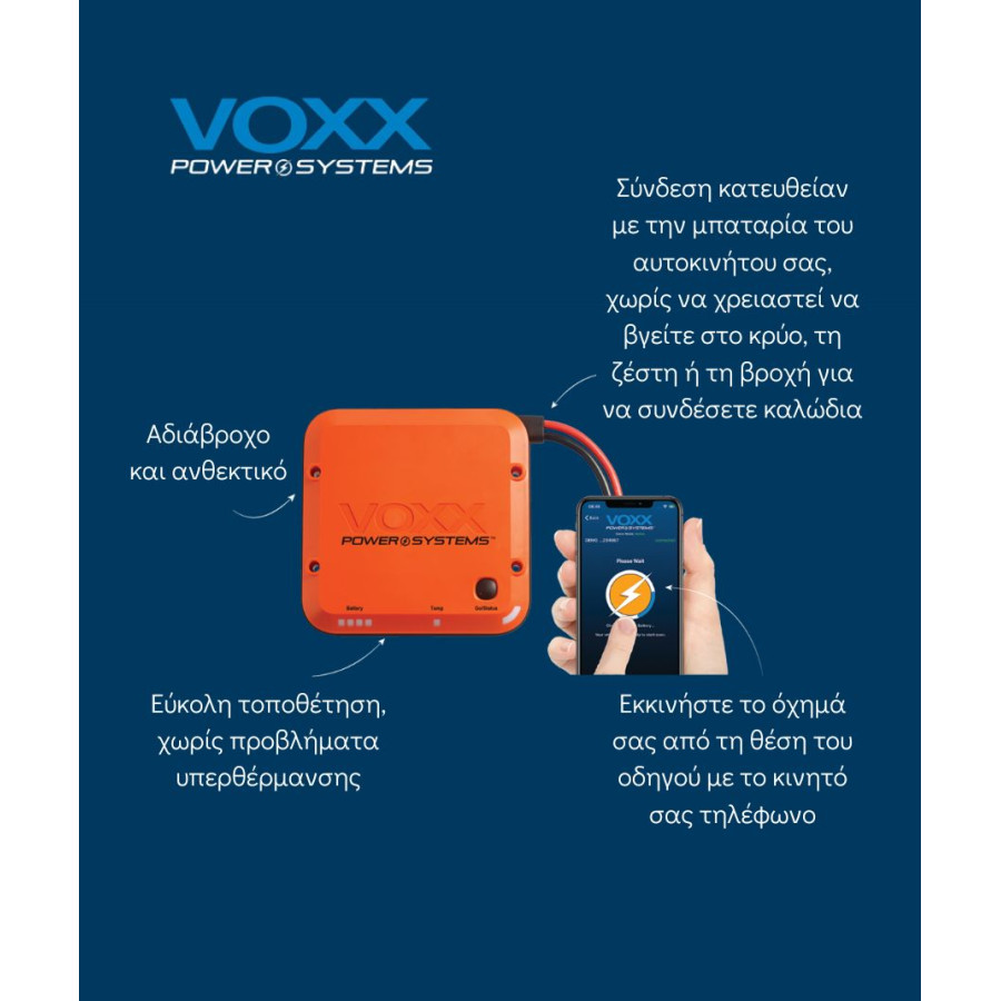 Voxx Power Systems POWV3.5 Powerbank Αυτοκινήτου που ελέγχεται μέσω κινητούΤο νέο προϊόν της Voxx σας παρέχει εκκίνηση έκτακτης ανάγκης όταν η μπαταρία του οχήματος σας έχει αποφορτιστεί. Δεν χρειάζεται να βασίζεστε σε δαπανηρή οδική βοήθεια , σε καλώδια βραχυκυκλωτήρων ή σε φορητές μπαταρίες που χάνουν τη φόρτιση τους όταν τη χρειάζεστε. Το Voxx Power System είναι προ-εγκατεστημένο και συνδεδεμένο απευθείας με τη μπαταρία του αυτοκινήτου ώστε να μπορείτε να το χρησιμοποιήσετε με άνεση και ευκολία! Ξεκινήστε το όχημά σας από τη θέση του οδηγού με το Smartphone σας (iOS και Android) χωρίς να χρειαστεί ποτέ να βγείτε έξω στο κρύο, τη ζέστη ή τη βροχή για να συνδέσετε καλώδια βραχυκυκλωτήρων. Το βολικό του μέγεθος επιτρέπει την εγκατάσταση κάτω από το κάθισμα ή στο πορτμπαγκάζ. Συμβατό με όλα τα οχήματα. Λειτουργεί χωρίς προβλήματα. Ισχύς κατά παραγγελία όταν τη χρειάζεστε. Ιδανικό για οχήματα έκτακτης ανάγκης, εμπορικούς στόλους ηλικιωμένους και πολλά άλλα. Αυτο-παρακολούθηση για την αποφυγή υπερφόρτισης. Ελέγχεται εύκολα μέσω Android και iOSΧαρακτηριστικά500mAh Battery Specs: